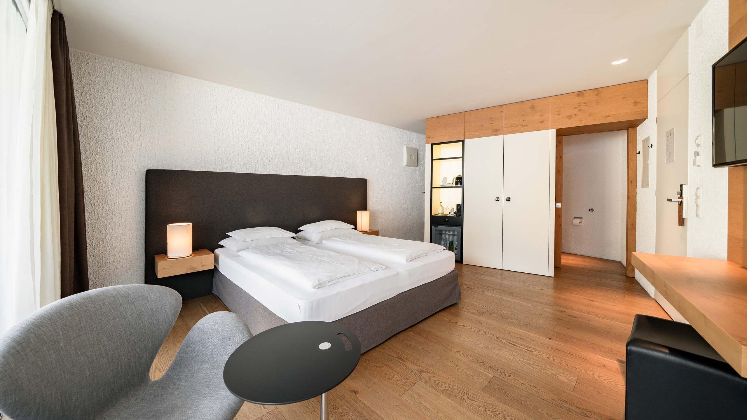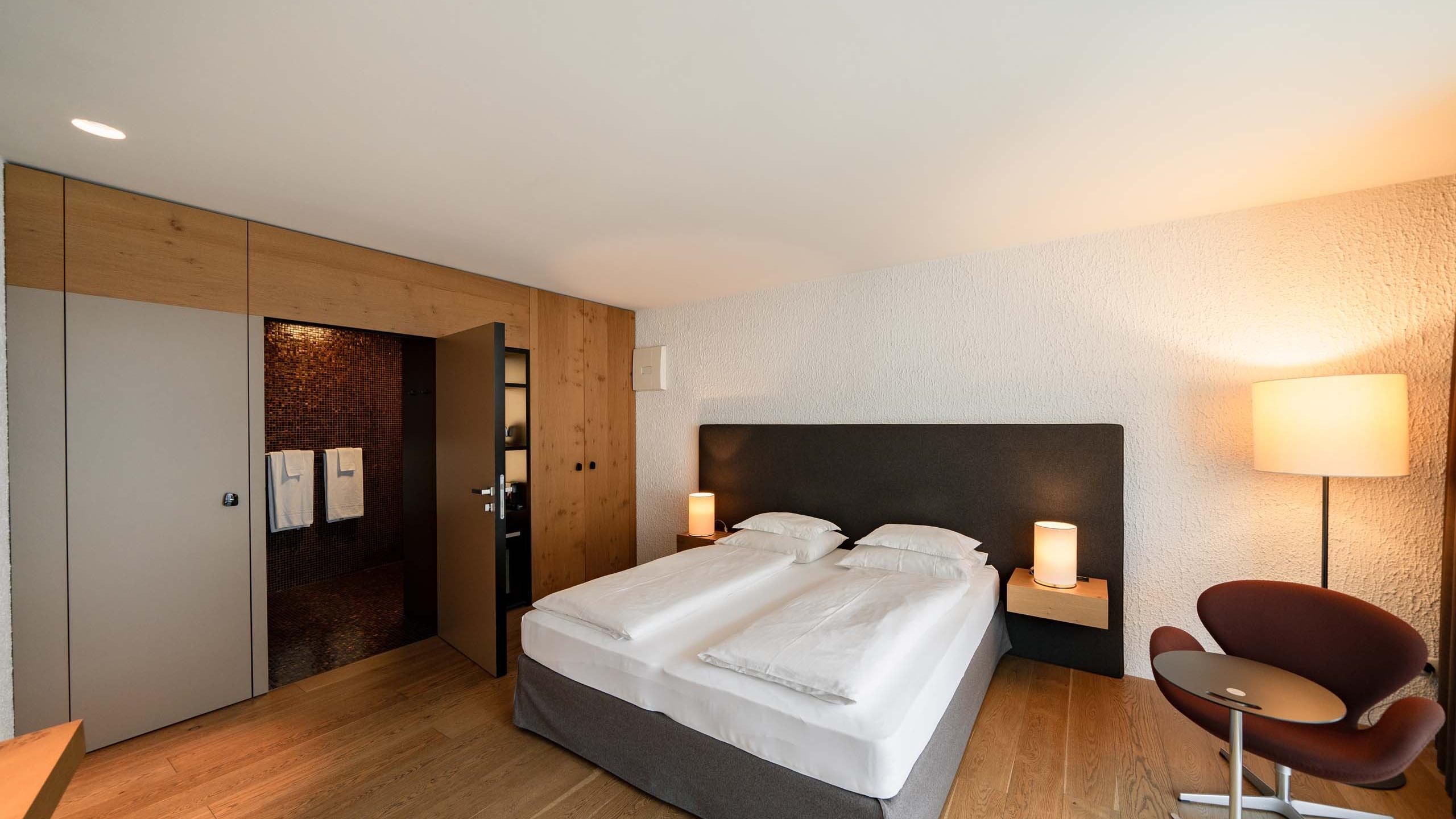 The loggia junior suite will delight you with its private 10m² loggia with far-reaching views over the rooftops of Brixen. It also features a double bed, bathroom, sitting area, coffee machine, TV, SMEG kettle, minibar, hairdryer, care products for skin and hair, shoe care kit, umbrella (even if the sun does always shine), and a reading corner with designer furniture.