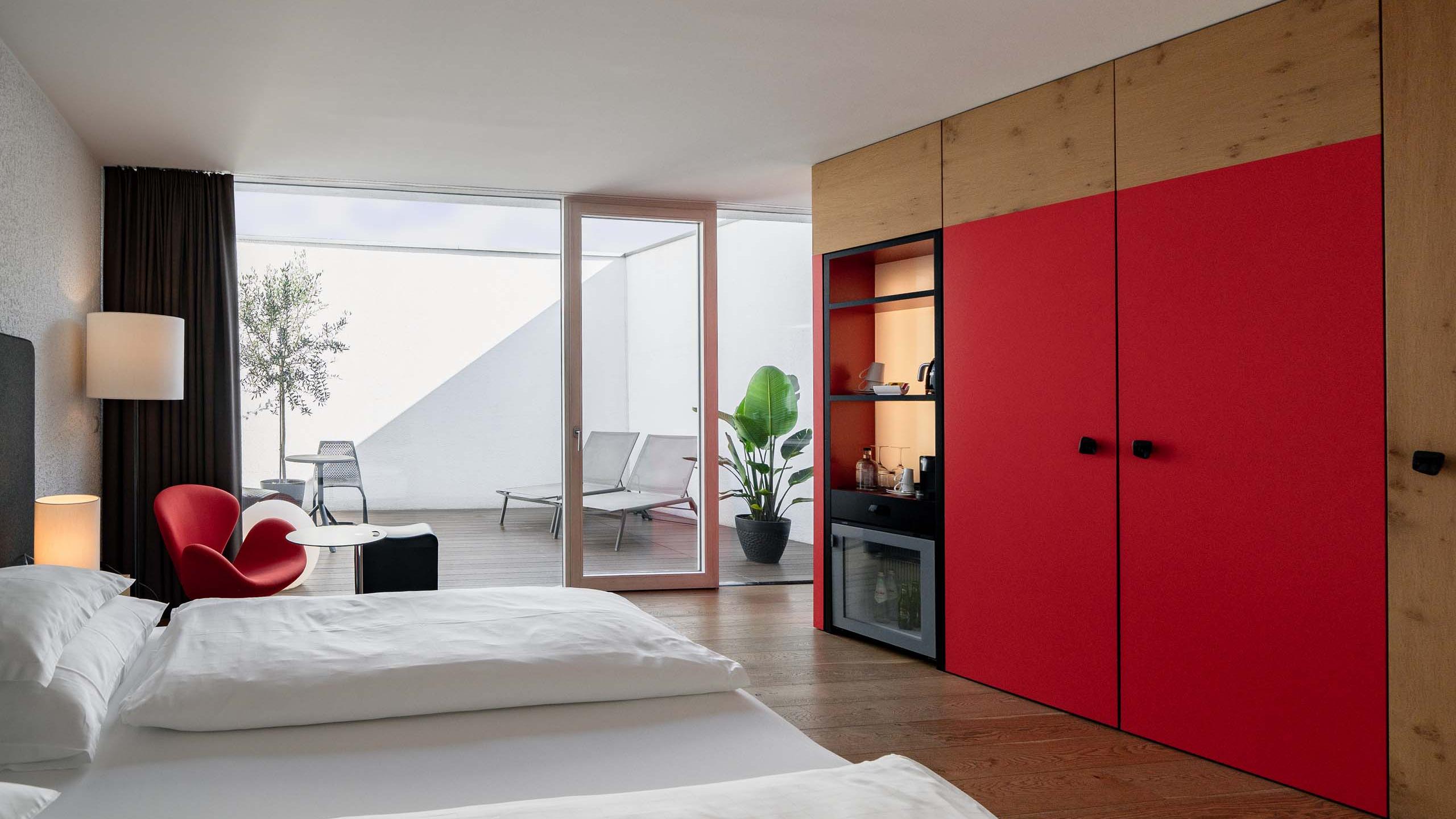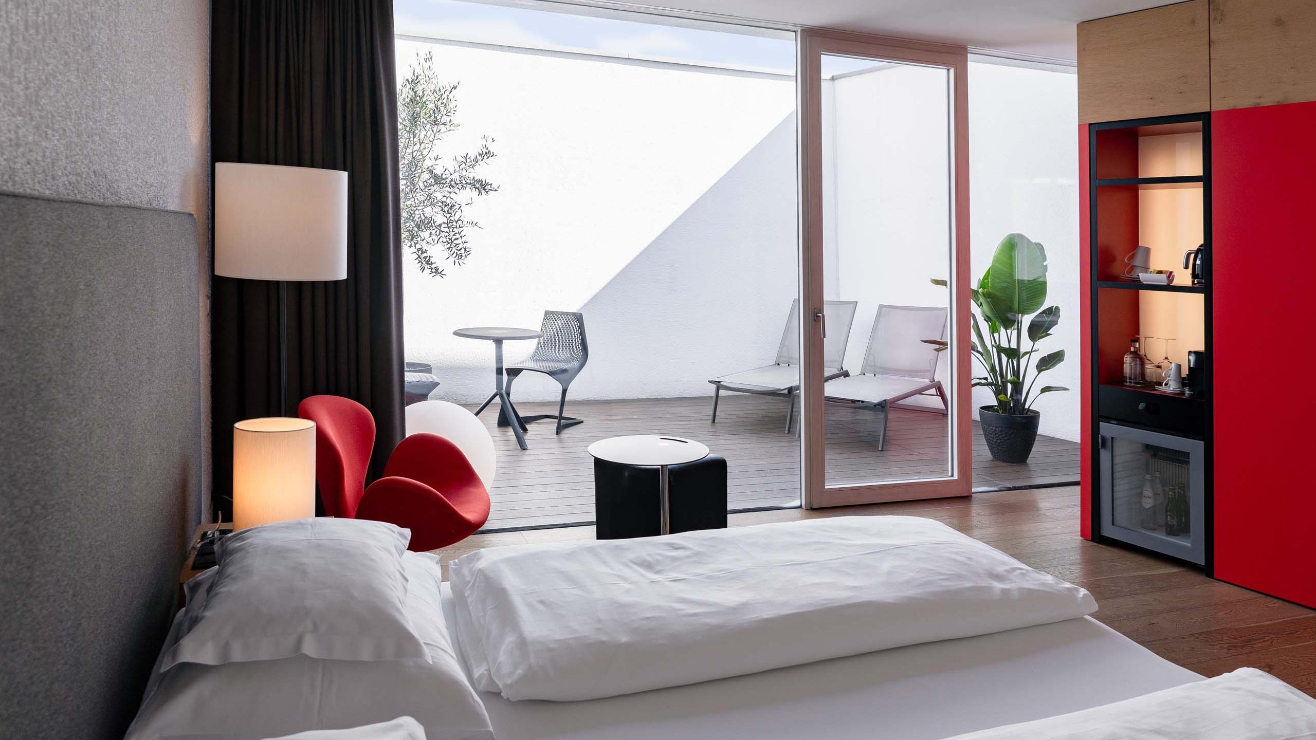 The terrace junior suite will delight you with a private, 25m² terrace with loungers and seating for soaking up the sunshine, relaxing, and enjoying the moment with your partner. It also features a double bed, bathroom, sitting area, coffee machine, TV, SMEG kettle, minibar, hairdryer, care products for skin and hair, shoe care kit, umbrella (even if the sun does always shine), and a reading corner with designer furniture.