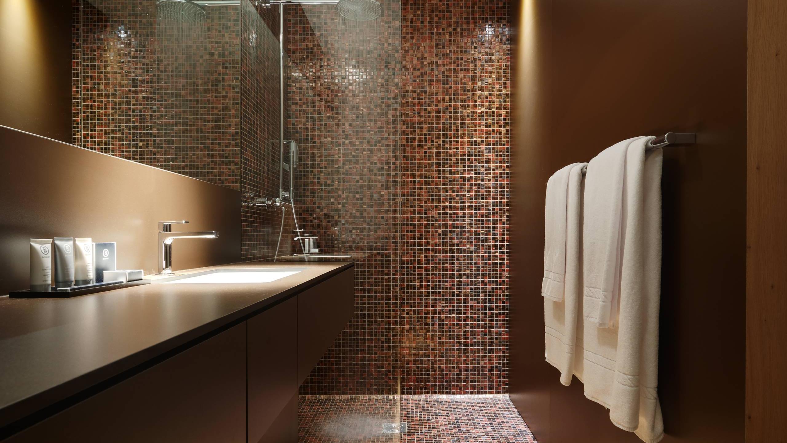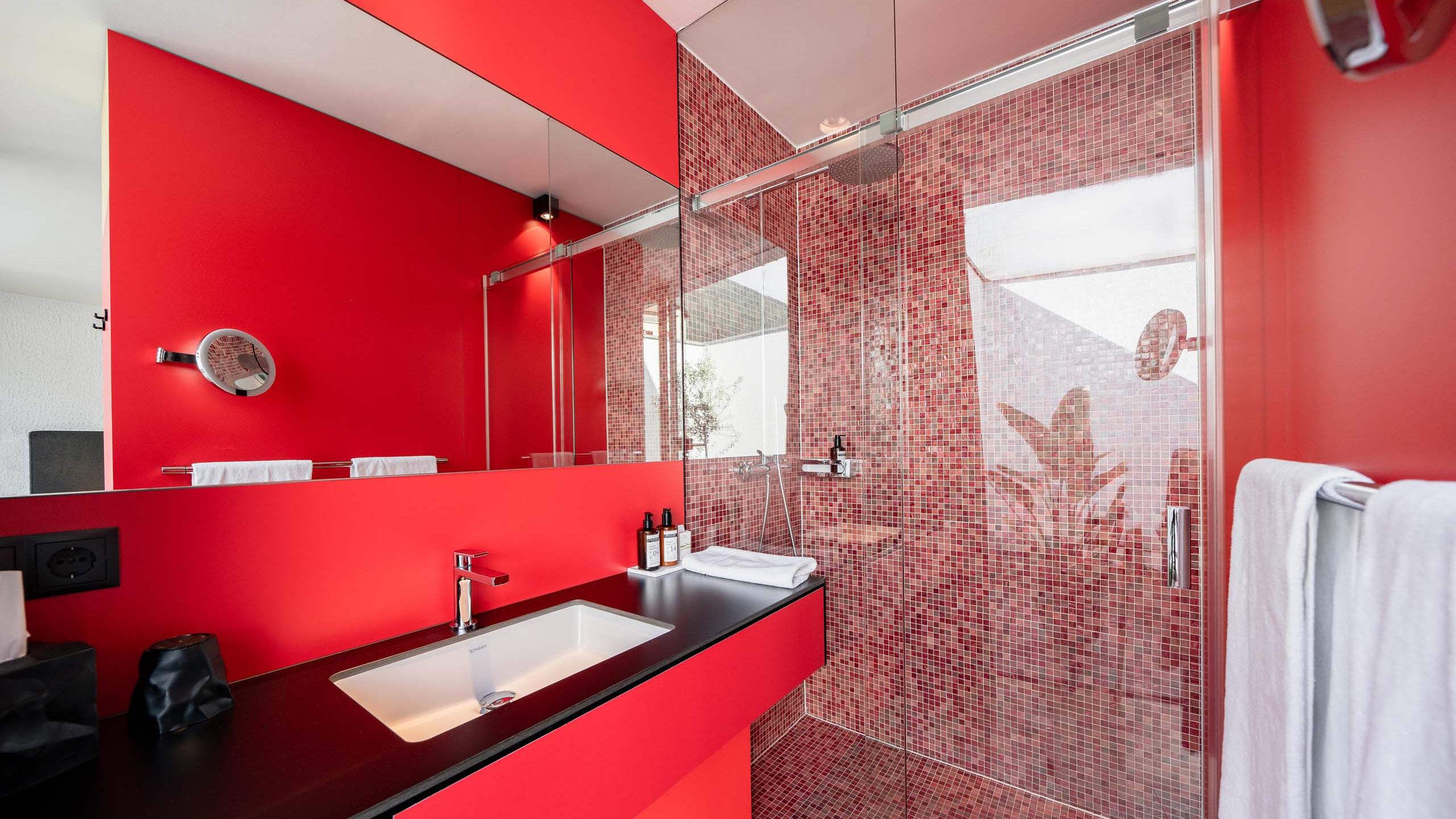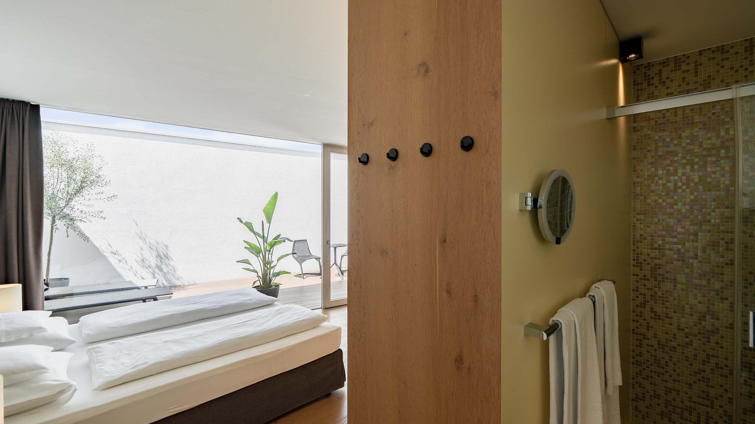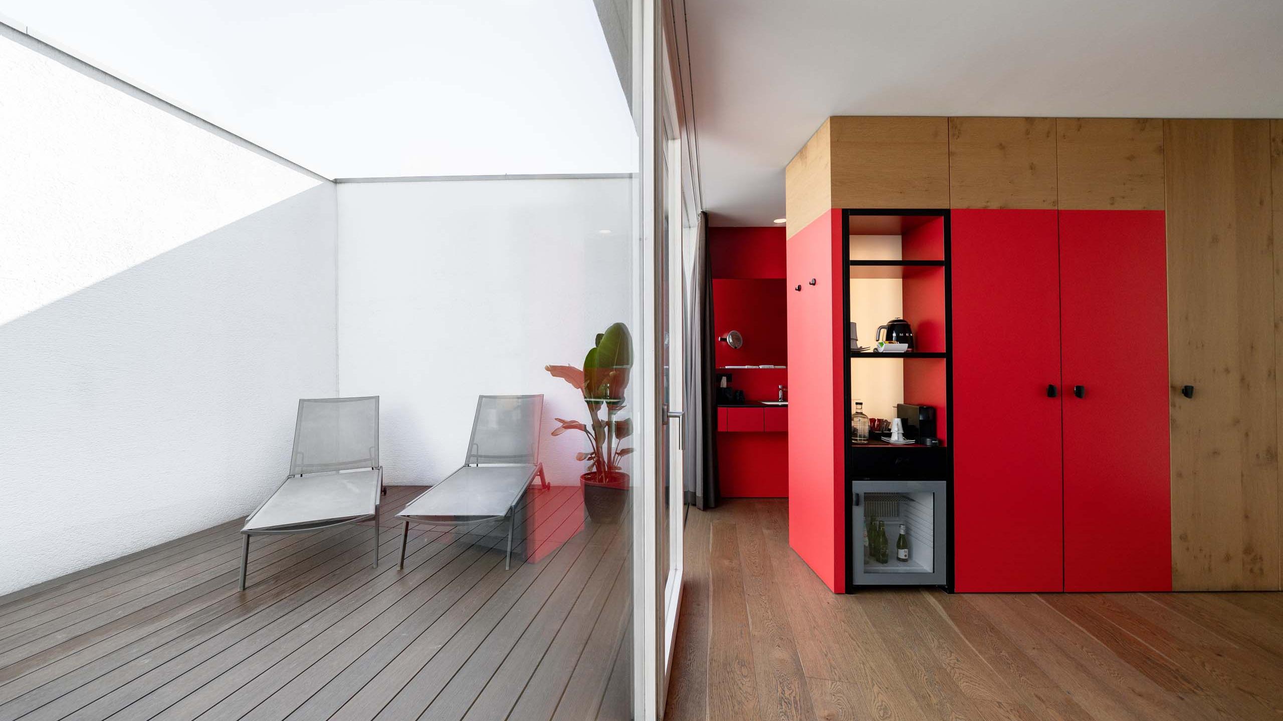 La junior suite con terrazza vanta una terrazza privata di 25 m² con sdraio e mobili da esterno, perfetta per rilassarsi e godersi il sole in compagnia del proprio partner. È inoltre dotata di un letto matrimoniale, un bagno, un’area salotto, una macchina da caffè, una TV, un bollitore SMEG, un minibar, un asciugacapelli, prodotti per la cura della pelle e dei capelli, un set per la cura delle scarpe, un ombrello (anche se il sole splende sempre) e un angolo lettura con mobili di design.